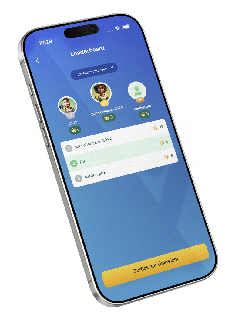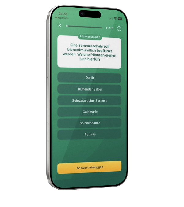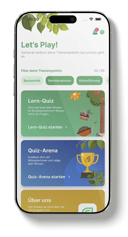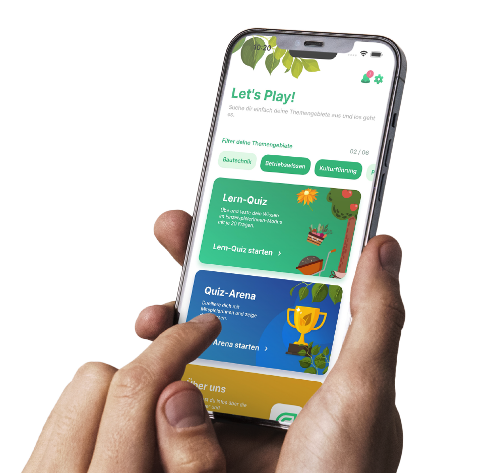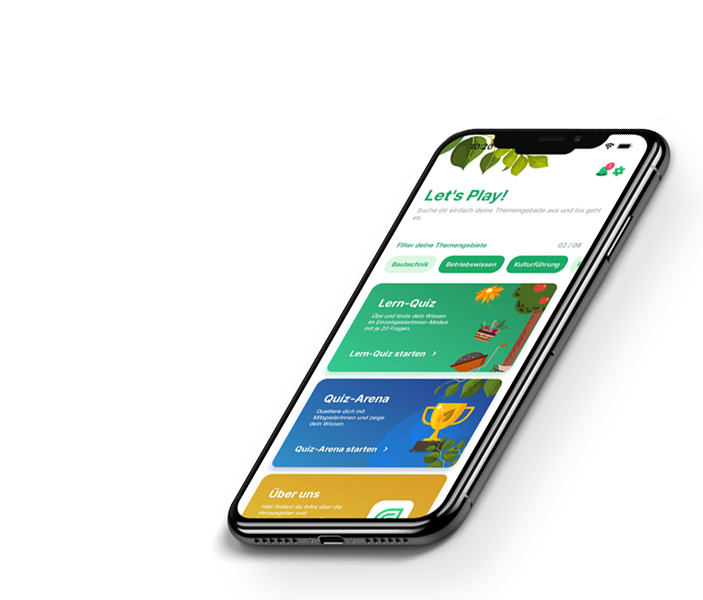 Starte noch heute mit spielerischem, praxisnahem Lernen in der grünen Branche. Lade die App kostenlos herunter und entdecke über 5.000 Fragen, Level und Funktionen. Wann und wo du willst.