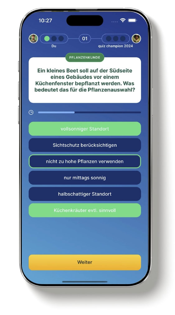 Die App hilft dir durch unterschiedliche Frageformate, darunter Multiple Choice oder Sortieren, gärtnerisches Wissen zu vertiefen und zu festigen. Fragentypen wie Buchstabensalat und Buchstabieren erweitern deine Pflanzenkenntnisse und vermitteln die korrekte Schreibweise. Die Fragen sind in unterschiedliche Schwierigkeiten sortiert.